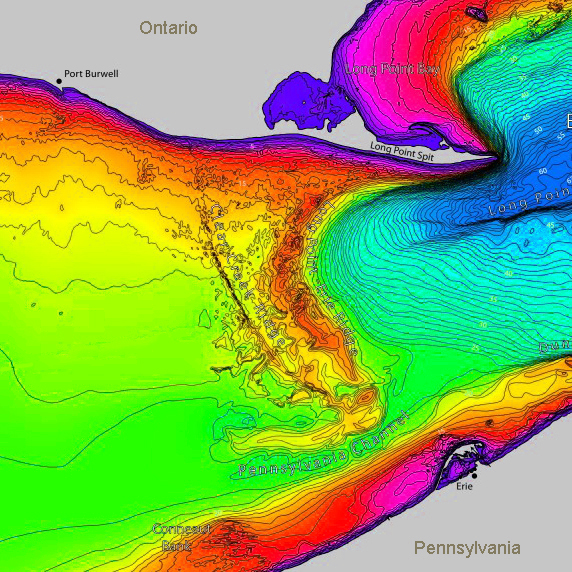 Below the surface there is a major ridge that influences the lake’s flow from west to east. It is also an impediment for deep draft ships. The west side of it is called the Clear Creek Ridge and the east side is called the Long Point – Erie Ridge. At the southern end of it, nearer the Pennsylvania side of the lake is the Pennsylvania Channel. Ever wonder why the big freighters are rarely seen from the Ontario side? In part it is because the Earth is not flat, but also it because those large ships use the Pennsylvania Channel. Occasionally, when there are very strong offshore winds coming from the north, the freighters will come into view as they detour to be nearer the north side to avoid the worst of the waves that reach their maximum heights to the south. Even then they will use the Pennsylvania channel.