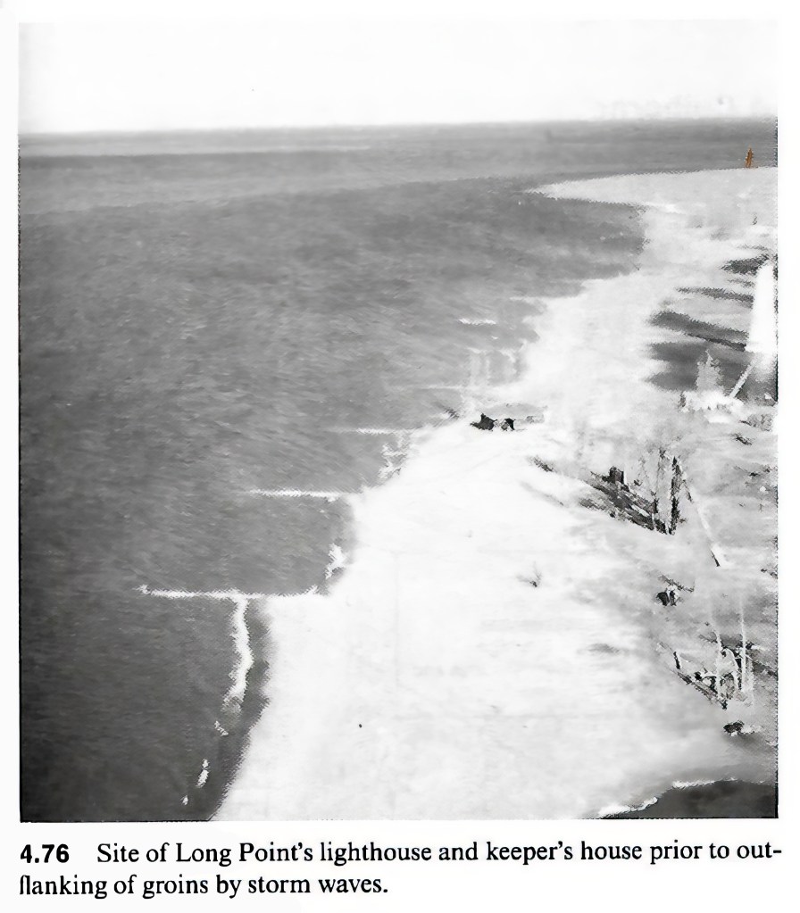 The groins that once were at the tip of the Long Point Spit were built to capture sand and protect the spit. They can be seen in a aerial photograph on page 179 of Living with the Lake Erie Shore. When were they built and how long were they there?