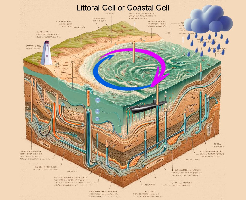 A littoral cell is a coastal section that contains one cycle of sedimentation including sources, transport paths, and deposit sinks.