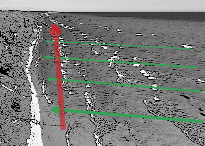 Littoral drift refers to the net movement of sediment such as sand grains in the directions of the longshore current. The longshore current generally moves parallel to the shoreline and is driven by the prevailing winds. As the wind direction can vary, so can the velocity (speed or direction) of the littoral drift. The momentum of the longshore currents will cause a delay in reacting to wind changes.
